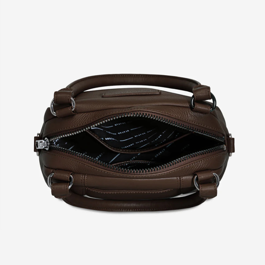 Good things come in small packages. Mini Mountains is a more compact version of the iconic Status Anxiety Last Mountains bag. This day-to-night companion can be worn on the elbow, shoulder, or cross-body (with an included long strap). Features a wide-opening main compartment, longer shoulder strap for added comfort, and secret magnet-close pocket on the outside for your phone etc.